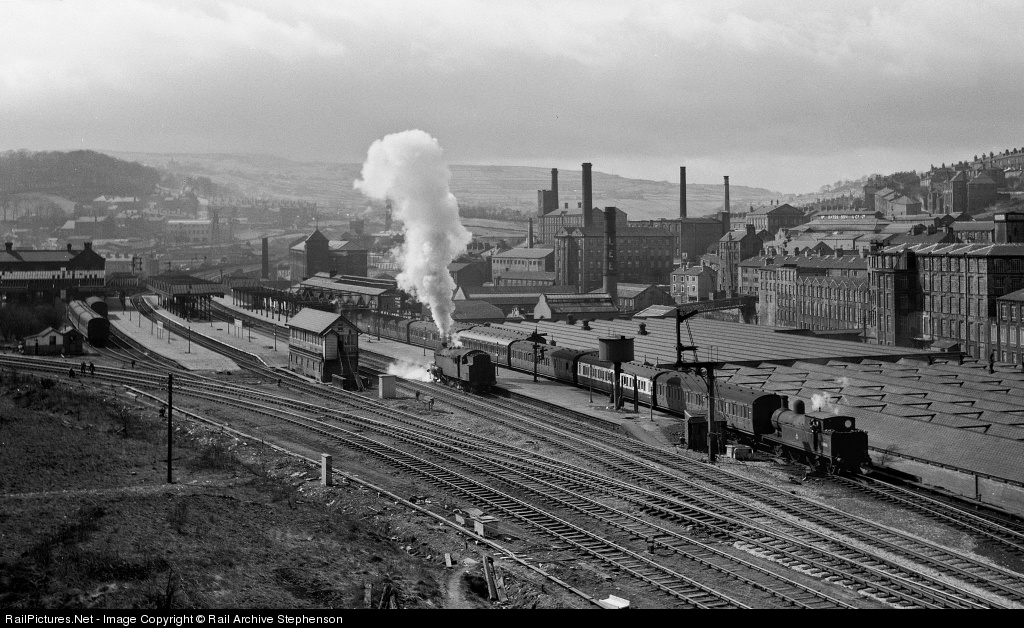 | A former Lancashire & Yorkshire Railway 2-4-2T No 50818 performs station pilot duty at Sowerby Bridge in West Yorkshire as an LMS class 4 2-6-4T reverses out of the station. This was one of the many mill towns in Lancashire and Yorkshire with the huge brick or stone built 'dark satanic mills' as they were often described because of the tough working conditions within. Scanned from a 6 x 9 negative by the late Kenneth Field of Golcar, Yorkshire. |