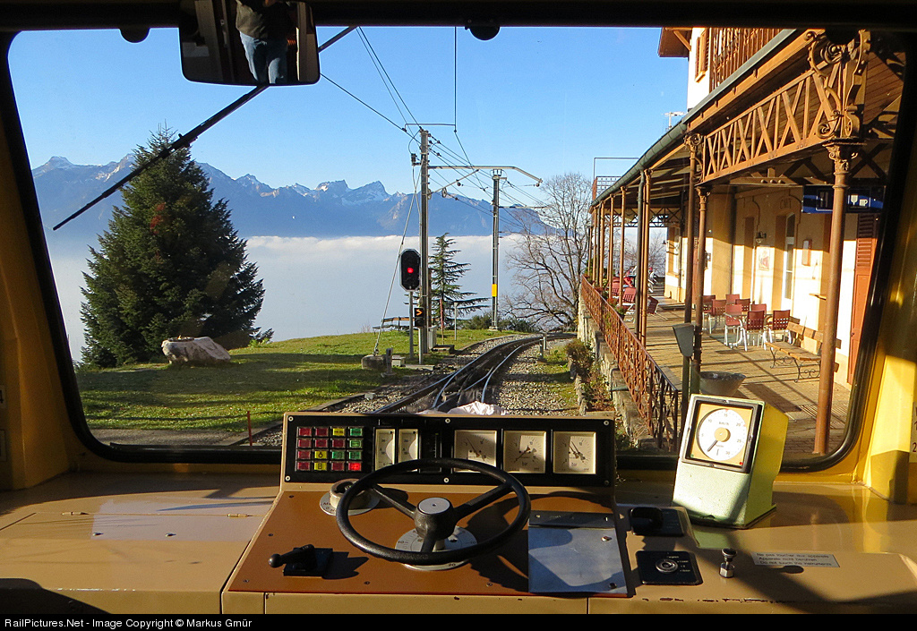 Phantastic view from the cockpit during the stop at the rear of the railcar from Montreux to Rochers de Naye. Right a part of the stationbuilding in Caux, in the background a sea of fog over the Lake Geneva