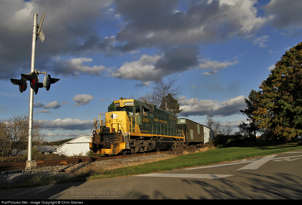 | Engineer Mike Kohl and conductor Kyle Sanders bring the Reading & Northern's Jim Thorpe-Tamaqua local westbound across Church Road near Hometown with SD38 2000. Once back in Tamaqua this train will become the "Reading Turn" and pick up two additional engines plus more outbound NS interchange traffic for the nocturnal round trip to Reading and back. |