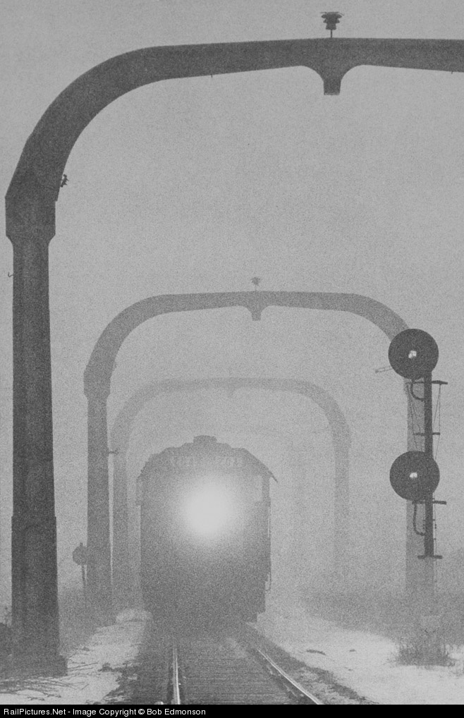 Unseasonably warm temperatures that Friday morning created a fog bank over Southeast Michigan. DT&I 204 pulls a string of cars from Flat Rock to Ford's River Rouge Plant in Dearborn. Concrete arches are the remnants of a short-lived electrification effort in the 1920s.