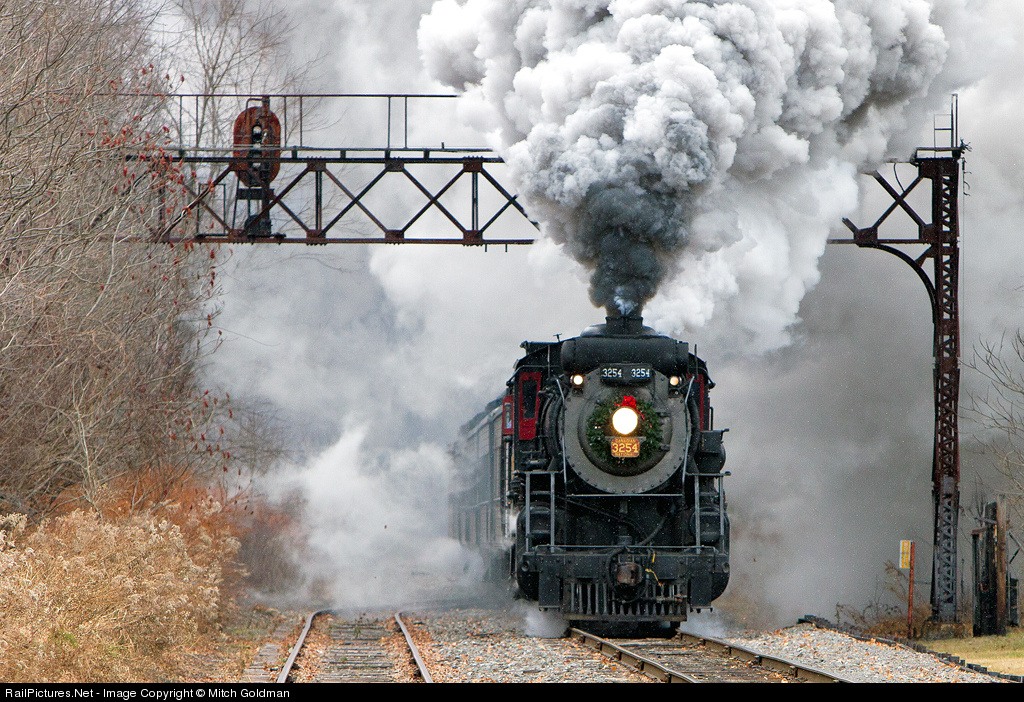 CN #3254 charges the grade at Moscow leaving the former DL&W signal bridge in it's wake. A holiday wreath signals the start of the Holiday season at Steamtown.