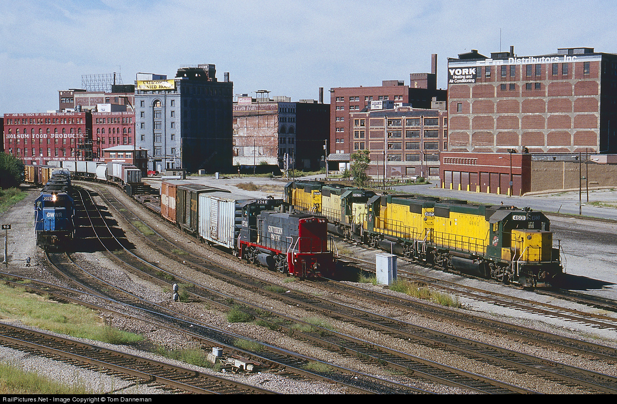 On September 16, 1990, a Southern Pacific MP15AC slides past a Gateway Western freight and four Chicago & North Western locomotives (2 GP38-2s and 2 SD40-2s) in West Bottoms, Kansas City.