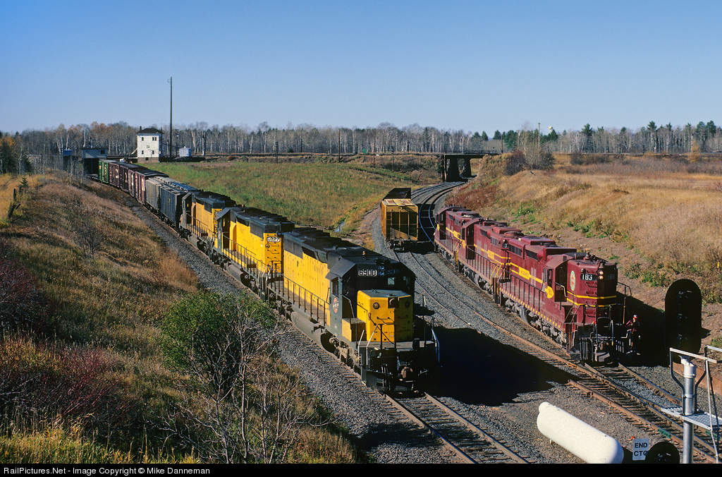 A Chicago and North Western freight with three EMD SD40-2s pulls up to the signals at Saunders, Wisconsin, on the morning of October 20, 1985. Soon after, a Duluth, Missabe and Iron Range transfer freight, with a nice matching set of vintage SDs as well, shows up and switches the siding there.