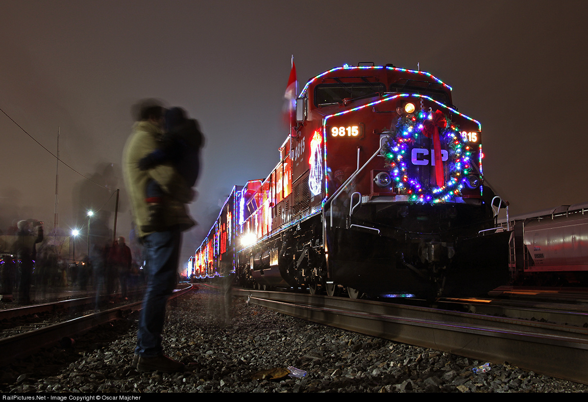 Many gather around this years CP Holiday train as it lights up Lambton Yard. A father and his son stay somewhat still for the 13 second exposure, as they observe the lead unit.