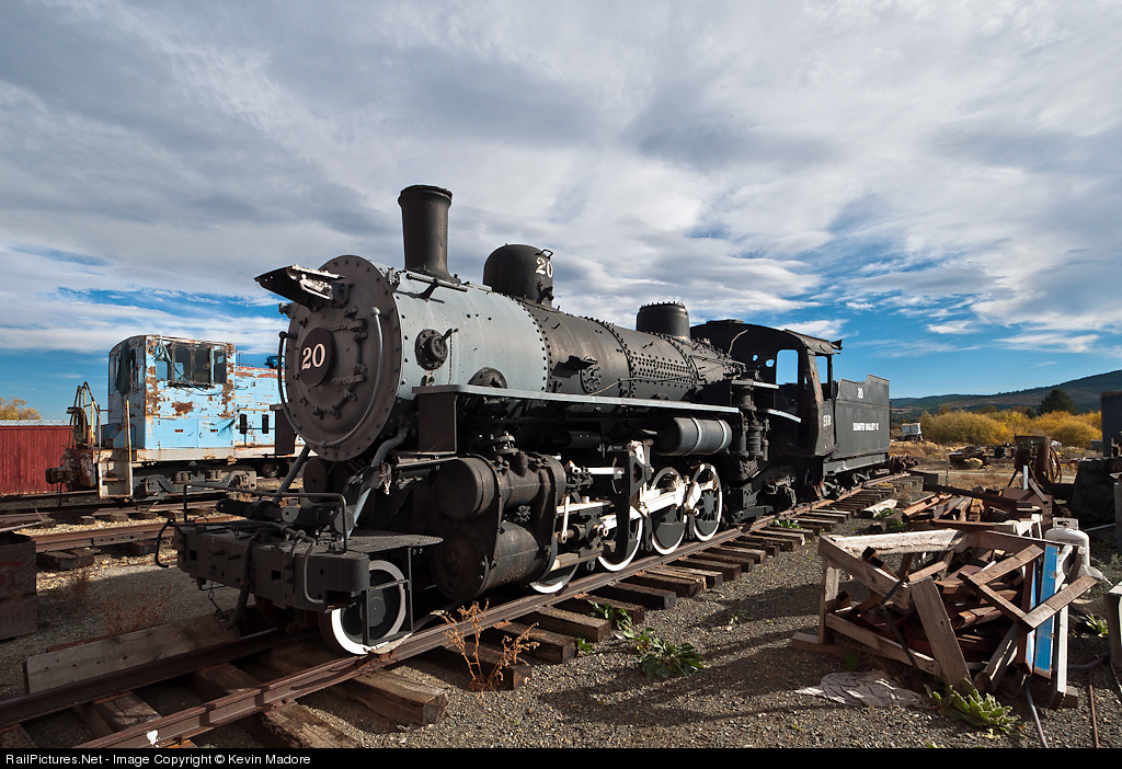 Sumpter Power: Mikado #20. The Sumpter Valley Railway's "other" Mikado is this 1920 Alco 2-8-2, which carries the line's number 20. The 20 and its sister engine, the 19, were identical locomotives and the only ones that the railroad ever purchased new from the factory. The pair were built as wood-burners, but were later converted to burn oil. They served the SVRy for 20 years, until 1940, when the line purchased a pair of big articulated engines. The two quickly became surplus and were sold to the White Pass & Yukon in Alaska. There, they spent another 18 years, hauling freight between Skagway and White Horse. Retired in 1958, the two engines sat unused in the Skagway Yard until 1977, when the restored SVRy inquired as to whether or not they could be donated back to their home operation. The White Pass agreed and the two were repatriated to Oregon, where they sat until the mid-1990s, when funds finally became available to restore one of them to operation. It was decided that the 19 was in the better condition of the two, so she was given the complete overhaul, while the 20 remained parked, awaiting a time when funds might become available to restore her as well. She is seen here behind the McEwen Shops in October of 2012. Viewers will note that the tender is reversed and the cab is in pretty rough shape. The SVRy Folks would love to put this engine back in service, but with the 19 currently undergoing a 1,472-day inspection, and Heisler #3 not far behind, the 20 is pretty low on the priorities list at this time.