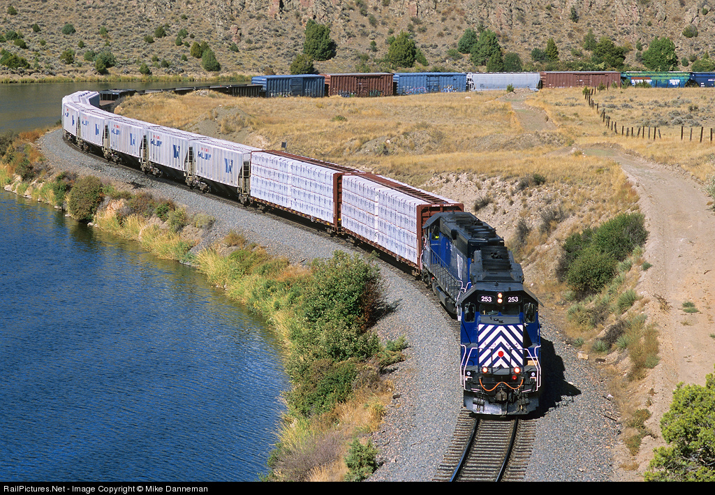 Montana Rail Link’s train No. 840, the Helena Local, curves along the Missouri River and the heart of Lombard Canyon, Montana, on the morning of September 22, 2009. On the point is a matching pair of EMD SD40s, Nos. 253 and 252, that MRL classifies as SD40-2XRs (rebuilt SD40s to Dash 2 standards that are eXtra Reliable).