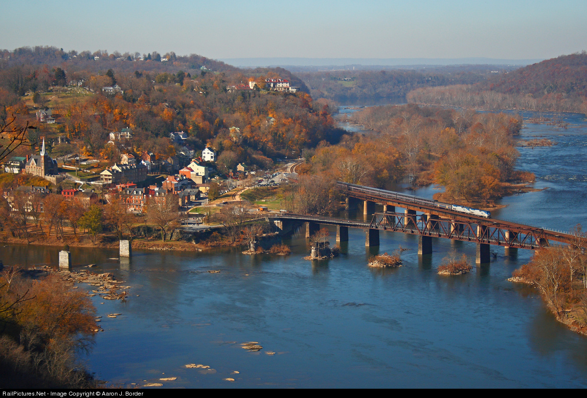| Amtrak's eastbound Capitol Limited departs historic Harpers Ferry, WV, on a cool fall morning, as seen from the Loudon Heights overlook. |