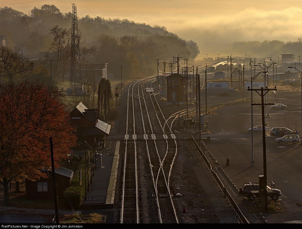A peaceful early morning in Brunswick, Maryland from an day gone by. The morning fog lifts to reveal the sizeable yard, B&O style CPLs, Baldwin designed train station and WB Tower.
