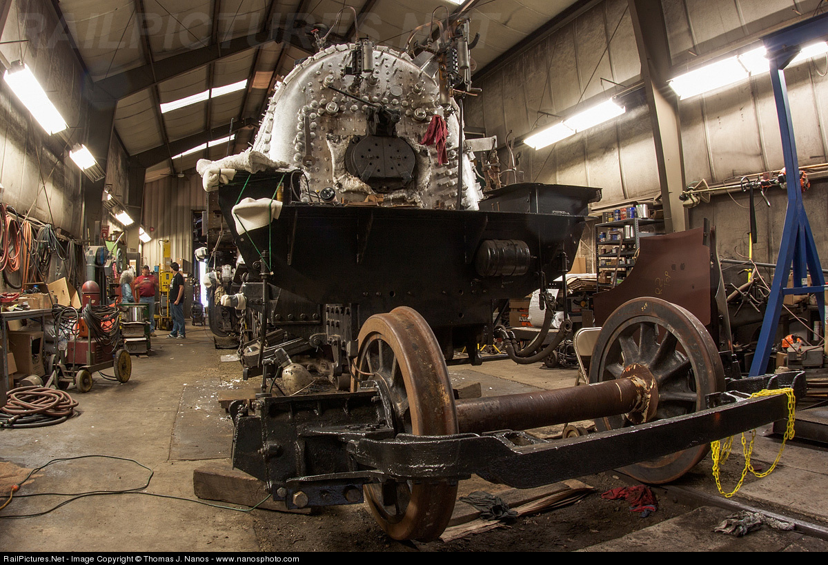 Valley Railroad No 3025s trailing truck is being readied to be placed under the locomotive int he railroad's Essex, CT shops. This was during the reubild project of the former Knox & Kane Chinese Mikado, which now plies the Valley Line as a simulated New Haven 2-8-2. Canon EOS 50D, Sigma 15mm f/2.8 EX Fisheye