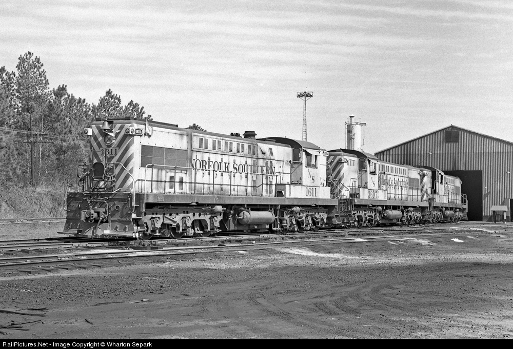 Three Baldwin AS-416's idle outside the diesel shop at Glenwood Yard, Raleigh, NC in December 1973. White flags are displayed on engine 1611, as this set of power will handle an extra south about 11:00 am from Raleigh to Gulf, NC and return.