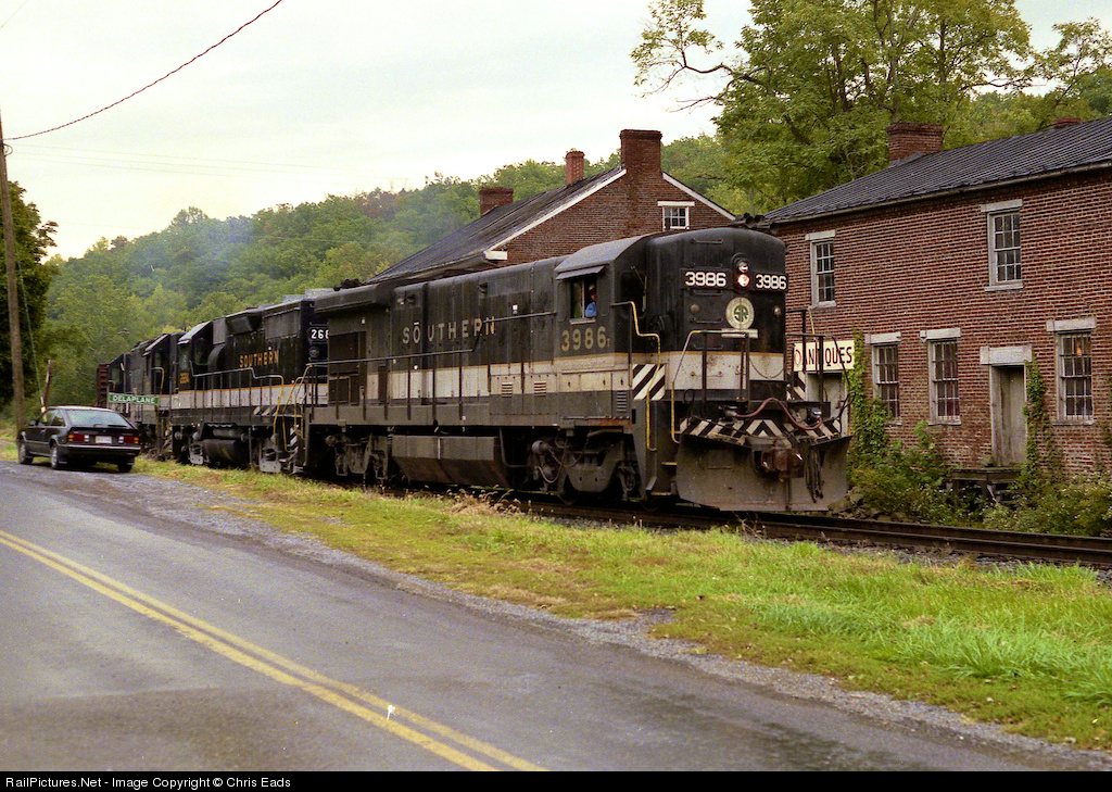Delaplane, VA, October 1987 - Though the Southern Railway had been a part of the newly formed Norfolk Southern for about five years at this point, this westbound Front Royal local with a B-23-7 and a trio of EMDs was "all Southern" as it passed through the tiny Virginia village under pouring rain. Finding a train on this line was a rarity in those days, before the NS upgraded the line to through freight status as a part of their new intermodal thoroughfare between the Southern's Atlanta to Washington mainline and the Norfolk & Western's Roanoke to Hagerstown line. Today, this route is known as the "B-Line", and sees several manifest and intermodal trains per day.