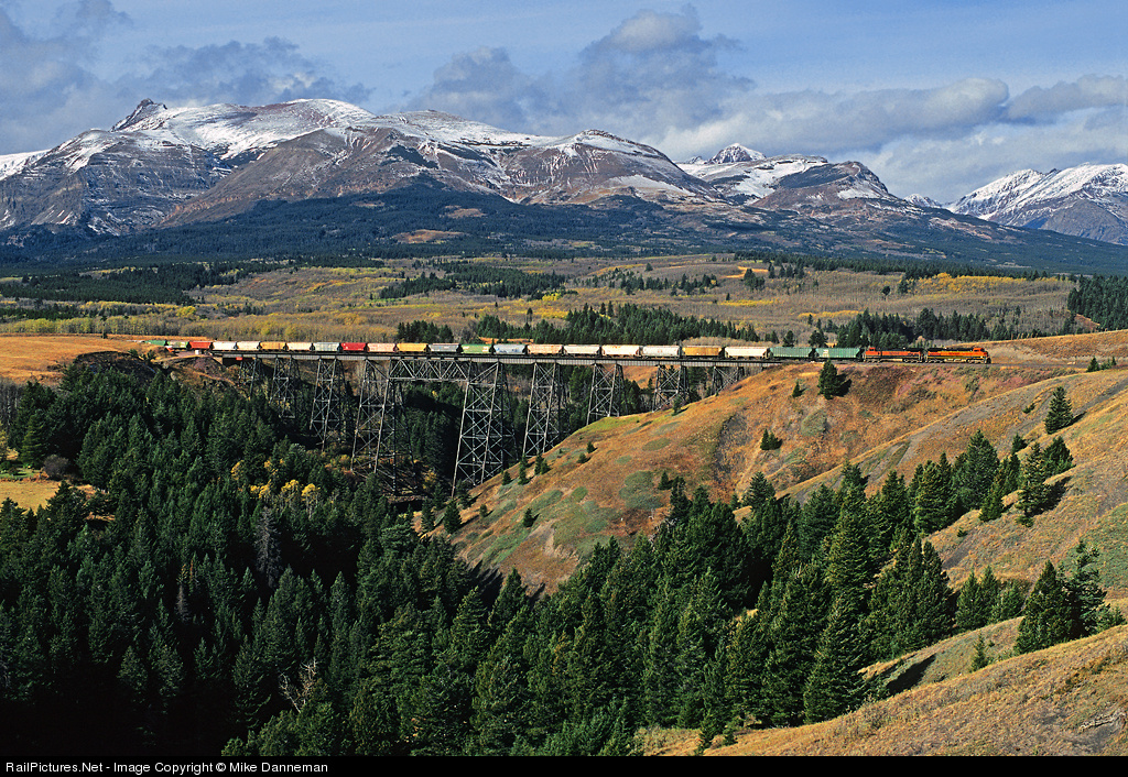 An eastbound BNSF grain train crosses Two Medicine Bridge at East Glacier, Montana, on October 10, 1997. Winter is coming, as most of the autumn leaves fallen to the ground and light snow dusts all the peaks in Glacier National Park in the background. The shear size of the bridge is more apparent from this view, whereas only a portion is visible at the more-commonly photographed view with the barn from Highway 2.