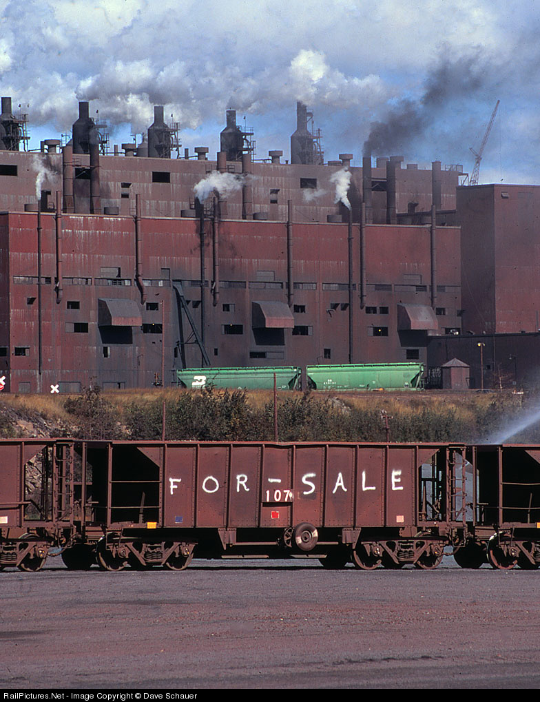 Shortly after LTV announced it was closing its mine and pellet plant in northern Minnesota an employee spray painted "For Sale" on one of the ore cars. Unfortunately a sale would never come and 1400 employees found themselves without work the following year. The massive pellet plant is on the hill and a pair of BN covered hoppers have delivered bentonite clay from Wyoming (used as a binder in making taconite pellets).