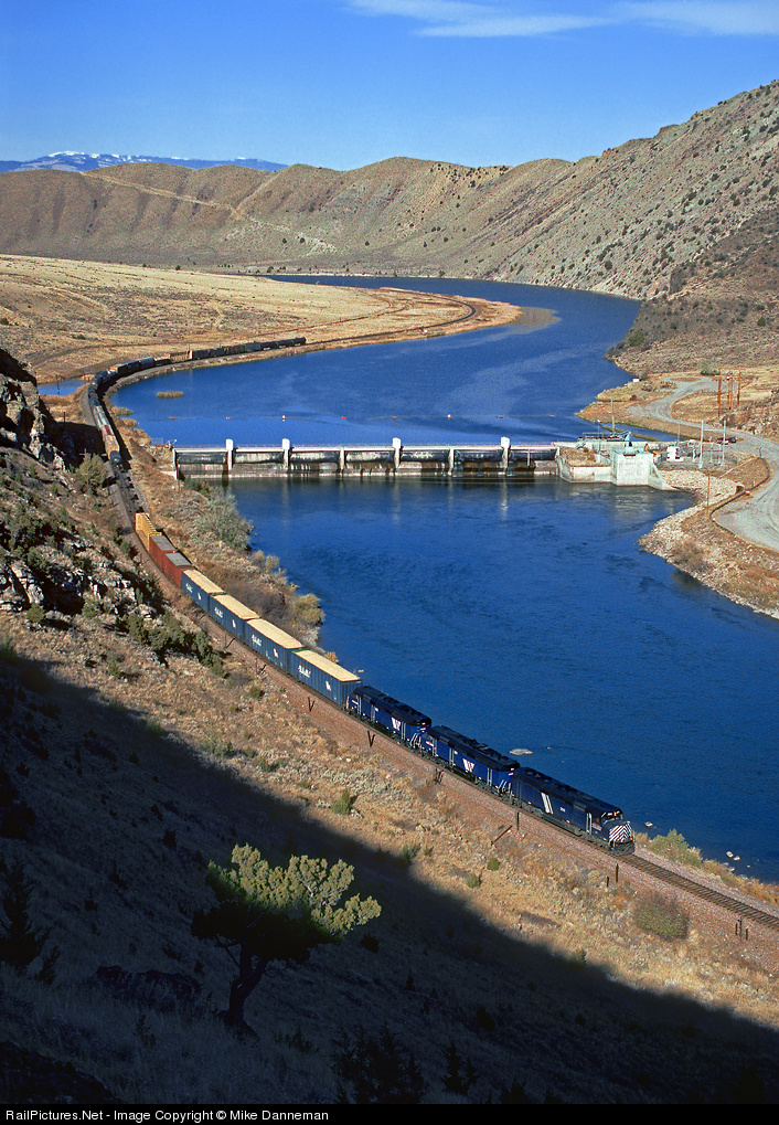 Curving past Toston Dam All three Montana Rail Link F45s power train LM (Laurel to Missoula manifest freight) by Toston Dam on the Missouri River as the train curves through Lombard Canyon in Montana on October 17, 2000. Electro-Motive Division F45s Nos. 390, 391, and 392 power the freight. At this time, a fourth F45 was in the Midwest assigned to IMRL, and would later return to Big Sky Country.