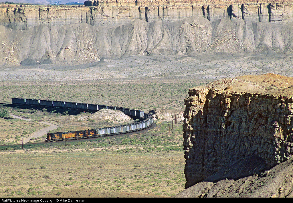 The eastbound Union Pacific “dirt train” curves through the cut at mile 607.35 on the Green River Subdivision main line east of Wash, Utah, on a pleasant June 22, 2004. This train was the last job on the UP to frequent Rio Grande Tunnel Motors, and powering the train today is D&RGW No. 5371, UP SD60M No. 2471, and SD40T-2s Nos. 5390 and 5349.