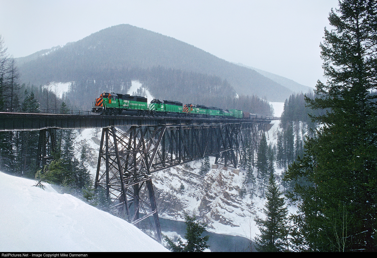 A Burlington Northern freight heads across Java Bridge at Java, Montana, on a frigid March 2, 1989. Trailing lead tiger-striped GP50 No. 3126 is a SD40-2, another GP50, a B30-7A and a fuel tender.