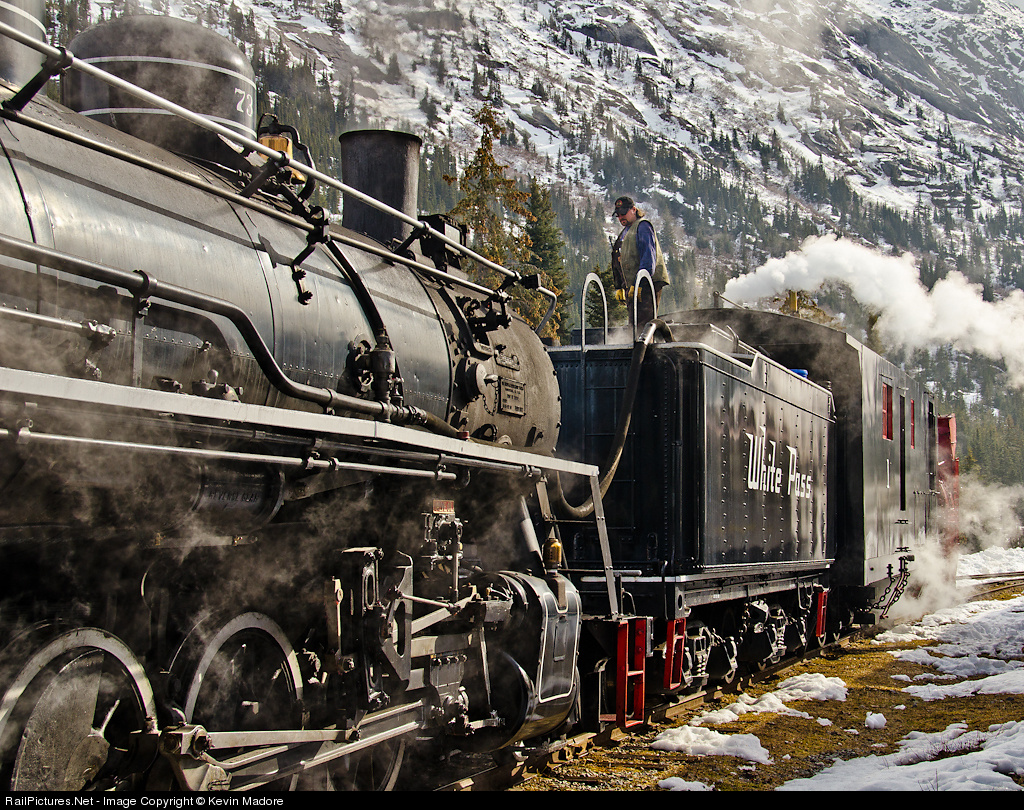 Nothing happens without water. White Pass Fireman Jeremy Simmons oversees the watering of Rotary Plow #1 during a brief servicing stop at Glacier Siding. Back when steam was the primary motive power on the White Pass & Yukon, a system of water tanks dotted the line from Skagway to White Horse. When dieselization occurred in the late 1950s and early 60s, the railroad management didn't envision any future need for that infrastructure, so nearly all of those tanks disappeared. Today, the lack of watering facilities on the line doesn't impact the line's limited steam program for the cruise ship tourists, as the trips are short and there are water sources in Skagway and Fraser. Operating the rotary snow plow for a spring line-clearing is an entirely different matter, however. Plow operations can be very time consuming and the saturated Rotary #1 sucks down the water at a prodigious rate. With no way to get to Fraser until the line is cleared, there is no ready source of water except Skagway....20 miles down a steep hill. To remedy this, the railroad brings up work trains with tank cars carrying both water and fuel oil for the locomotives. These trains are positioned at strategic places like Glacier Siding, and they follow the plow train wherever it goes. Water is life for humans and that goes for steam engines as well. Run out on the WP&YR and it's a long walk home.
