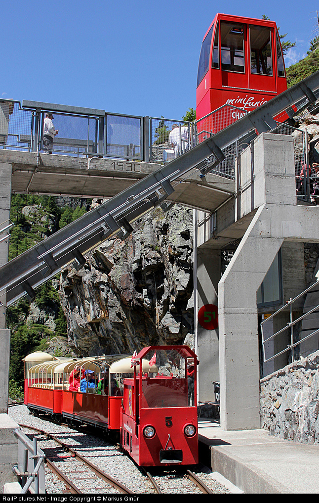 | 'The Little Panoramic Train' (below) runs between Les Montuires and Lac d'Emosson, gauge 600mm. This touristic train is a part from the route from Le Chatelard - Cable Car - Les Montures - Little Panoramic Train - Lac d'Emosson. This train is standing in the valley station from the Lac d'Emosson, the mini-funic (above) goes up to the upper station (1964 meters over sealevel). This is a very imposing route along the rocks |