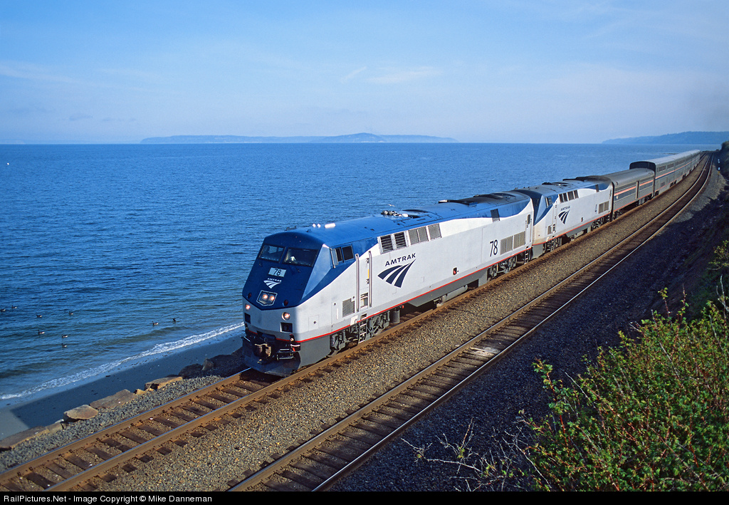 Almost there Amtrak's westbound “Empire Builder” slides along the waterfront at Edmonds, Washington, on April 16, 2010, and will soon be ending a long trip from Chicago to Seattle. At this angle, the “bow waves” of Amtrak’s Phase 5 paint scheme on the P42DCs seem to mimmic the blue waters of Puget Sound, where a flock of migrating Brant geese watch the train go by from waters edge.