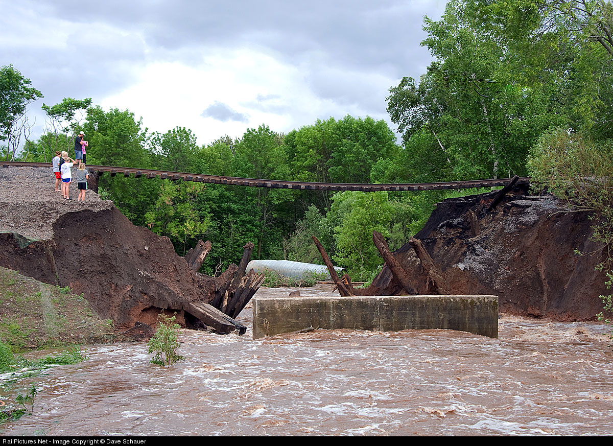 Railroad archeology courtesy of Mother Nature. BNSF's former NP "Shortline" mainline into Duluth hangs high the day after record rainfall blew out a culvert (seen in the distance). The old pilings from when this was a bridge can bee seen as well as the black cinder-like material used as fill, one reason it might have been easy to wash out. BNSF has not yet repaired this line yet, leaving a single shipper stranded and having to use trucks.