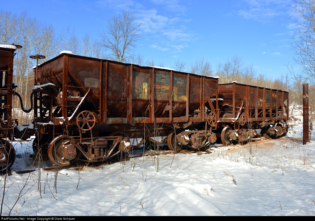 Old and cold. These three 1907-built ore cars lasted as long as they did on the DM&IR because of their manual door opening wheels located on either end. They made great cars in ballast service. Loaned and later donated to the Lake Superior & Mississippi tourist railroad in the early 1980s the cars sit unused today with mother nature slowly reclaiming the area around them.