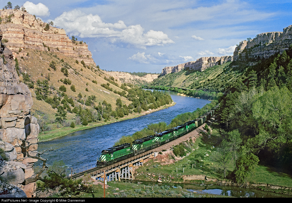 A Burlington Northern Santa Fe coal empty traverses scenic Wendover Canyon, Wyoming, on the afternoon of May 25, 1997. It still looks like Burlington Northern, with five Cascade green motors on the point; three Electro-Motive Division SD40-2s and two General Electric C30-7s.