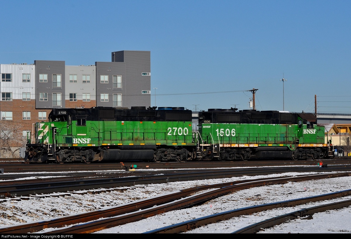 | It's not every day you get to see a pair of cascade green Geeps working the Denver Yard. BNSF 2700 (GP39-2) pairs up with 1506 (GP28M) and heads to the yard to shuffle freight cars. |