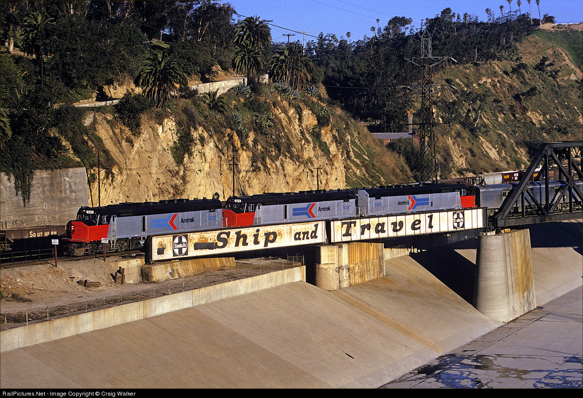 Amtrak's #3, the Southwest Limited, crosses the Los Angeles River as it approaches its final destination at Los Angeles Union Passenger Terminal early in the morning in February 1974. A trio of EMD SDP40F diesels (523, 525 and 505), from Amtrak's first order of new power, leads the train on this day. In the early days of Amtrak, Santa Fe would not allow the use of their Super Chief name to be used by Amtrak, hence the train's early moniker Southwest Limited. In October 1984, Santa Fe deemed Amtrak's improvements to this train sufficient and the railroad allowed the use of their trademarked name to be used by Amtrak, and the old Super Chief was reborn as the Southwest Chief. Note that the old Santa Fe advertising on the bridge was still in place, and that the L.A. River’s concrete banks are not covered in graffiti! (And what appears to be graffiti on the retaining wall on the left, behind the cut of cars, is actually an old advertisement.)