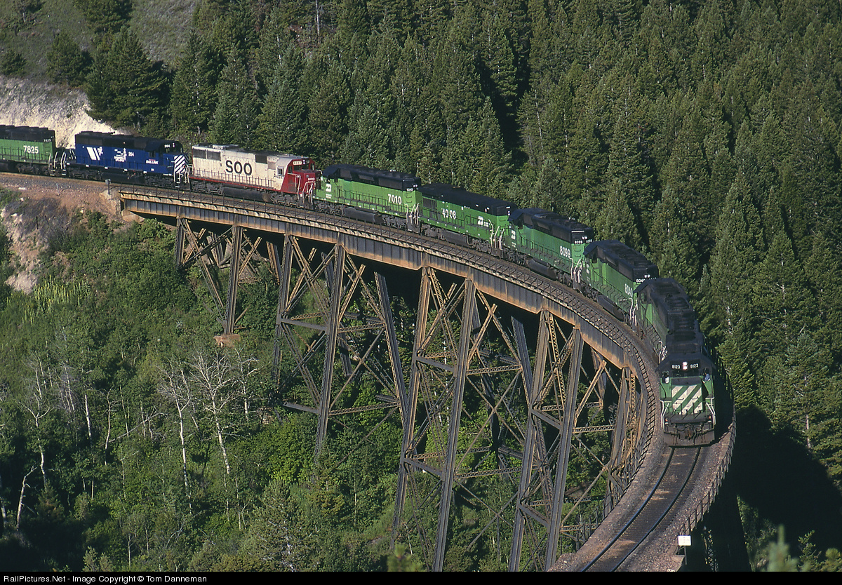 An eastbound BNSF baretable train rolls across Greenhorn Creek Trestle on Montana Rail Link's 3rd Subdivision over Mullan Pass. The consist includes 5 BN SD40-2s, a BN GP50, a BN B30-7AB, a Soo Line SD60, and a MRL SD40-2XR.