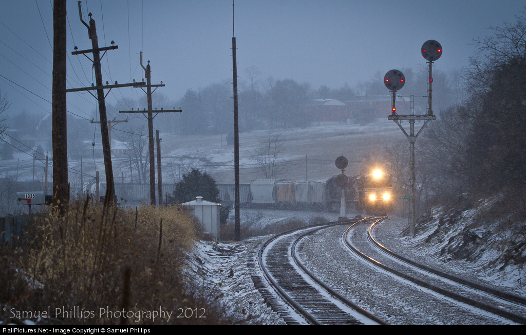 | On a frigid December 21st, 2012 evening, NS 38Q knocks down the Wytheville signals as it takes the siding to meet three apposing westbounds. The train will fit into this 5500' siding with only a few extra feet to spare and after the meet, it will be "hammer down" to Roanoke. |
