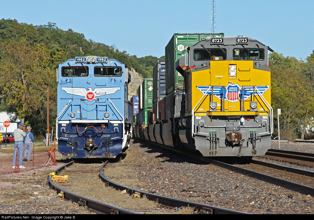 Nearly new Union Pacific SD70ACe #8723, serving as the DPU on ZSEMN 19, glides past the Missouri Pacific heritage unit at Pacific, MO. UP 1982 was on display for the town's entry into UP's "Traintown U.S.A" registry.