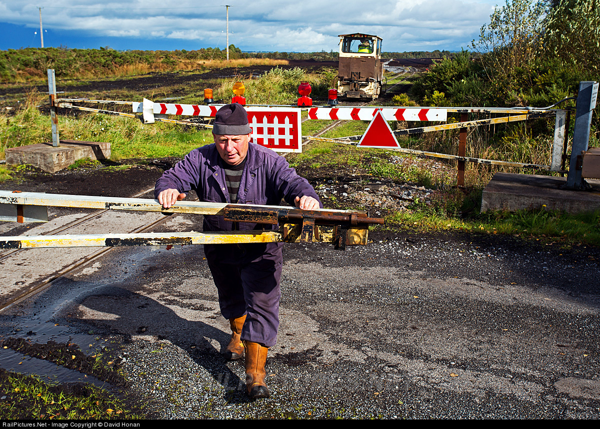 Locations where Bord na Mona's 3-foot narrow gauge tracks cross public roads are guarded by manually-operated gates and split-point derails (known locally as "catch points"). Normally left with the gates set across the tracks, upon approaching a crossing rakes must stop; the driver dismounts, walks ahead and swings the gates to block the road, which activates the flashing lights. An ingenious pulley-and-cable system simultaneously lines the derails to the closed position. After passing, the driver has to stop again and close the gates behind the train before proceeding.