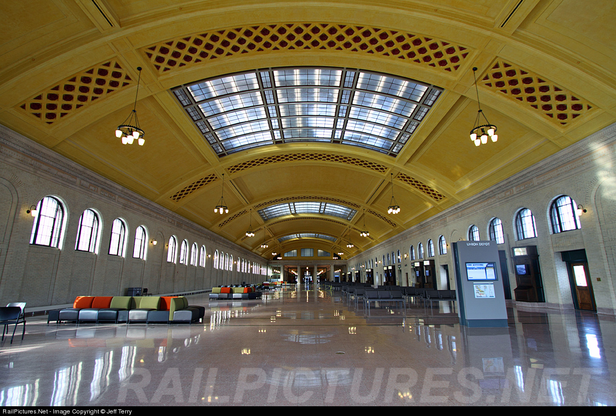 The $243M restoration of St. Paul's Union Depot has been completed and the concourse is open to the public for the first time since the late 1970s. Note the skylights, blacked out during WWII, that have been opened up to let in more natural light. Amtrak service is coming in 2013 and light rail service in 2014.