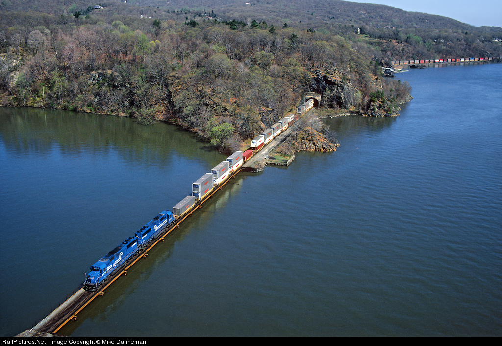 In a view from the famous Bear Mountain Bridge, a southbound Conrail stack train crosses Popolopen Creek Bridge at Fort Montgomery, New York, on April 14, 1991. Two EMD SD50s, Nos. 6739 and 6831, pull the long train along the blue waters of the Hudson River.