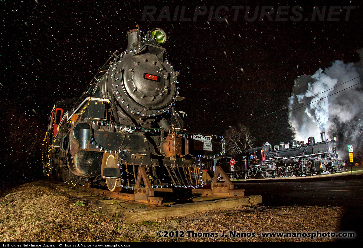 Coworkers. As the snow begins to fly, Valley Railroad Mikado No 40 pulls a trainload of families out of Essex Station with the second run of the North Pole Express. In the foreground is Valley Veteran No 97, currently residing on the display track. The long-time Valley Railroad locomotive is awaiting her turn at the rebuild program, after using up all of her FRA operating days.
