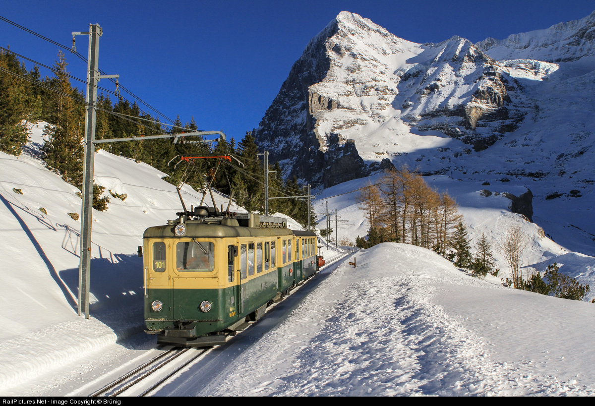 Historic railcar BDeh 4/4 101, built in 1947, descends slowly to Wengen as regular regional train. On days with a high operating grade, the WAB railway company fall back on this railcar and even freight locomotives to haul their trains.