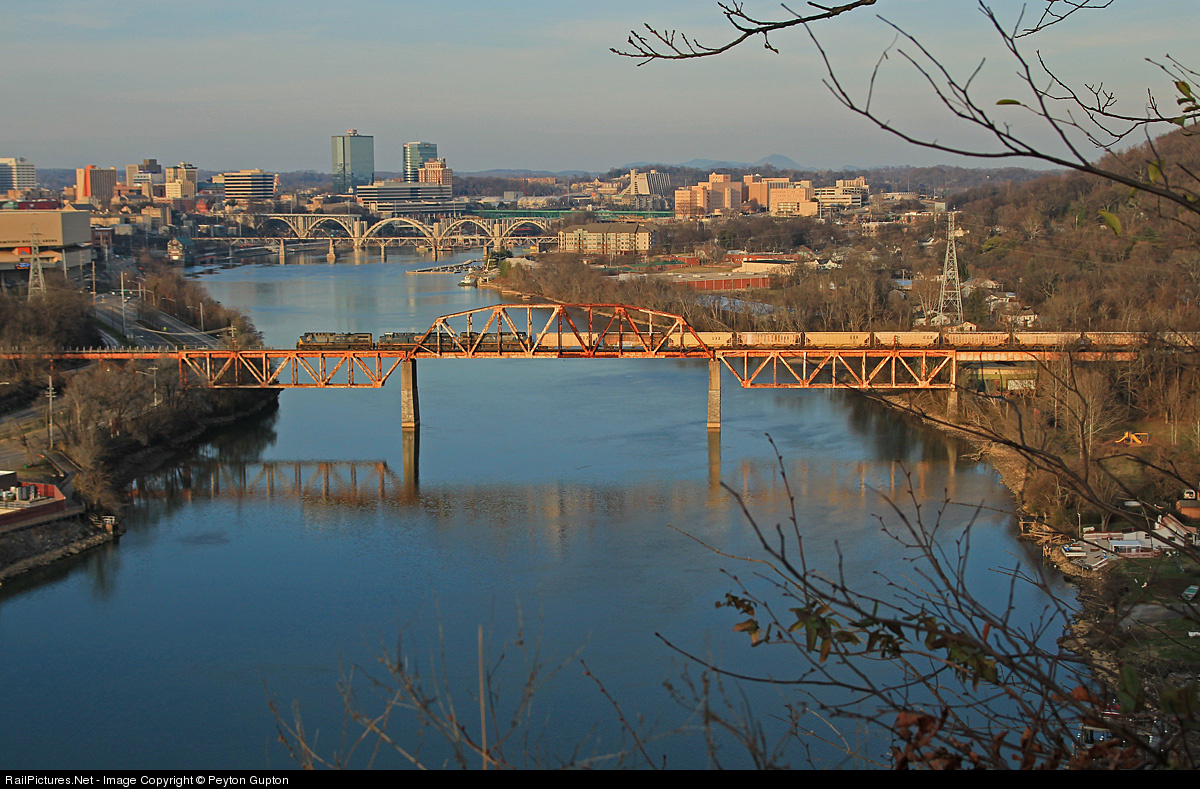 A CSX manifest crosses the Tennessee River into Knoxville just before sunset.