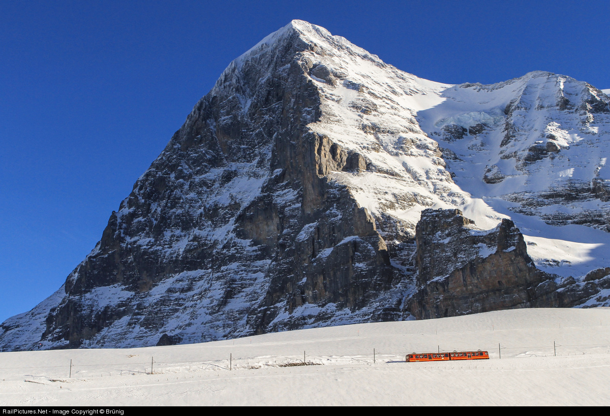 | Cogwheel railcar BDhe 4/8 215 as regional train on his way to Jungfraujoch - Europe's highest railway station on 3'454m (11'332 ft). The trains climb up by crossing the Mt. Eiger you can see in the background (height 3970m / 13'025 ft above sea level). If you watch hard enough, you can even figure out the windows of the station "Eigerwand". |