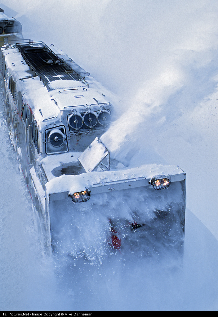 A closeup of Union Pacific rotary snowplow No. 900082 clearing out a cut as it approaches a snow-clogged Sharon Springs on New Year’s day in 2007. The circular windows are special snow-fighting windshields that spin to avoid accumulating snow and ice from building up on the glass. Quite the “snowblower!”