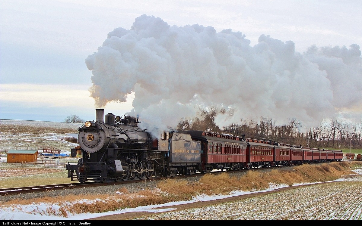 | The last day of 2012 was spent at the Strasburg Railroad with a friend. We went to the little crossing just north of the Groffs curve. As we prepare our camera's, N&W 475 works a 9 car train in freezing cold weather up the hill. They spun it a time or 2 but eventually pushed all the way up. Seen here, 475 begins charging the grade and putting on a heck of a whistle show. |