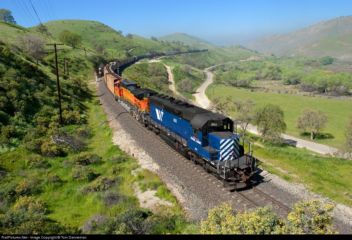 | Looking somewhat out of place, Montana Rail Link SD40-2XR no. 262 pushes on a BNSF freight on Tehachapi near Caliente, CA. |