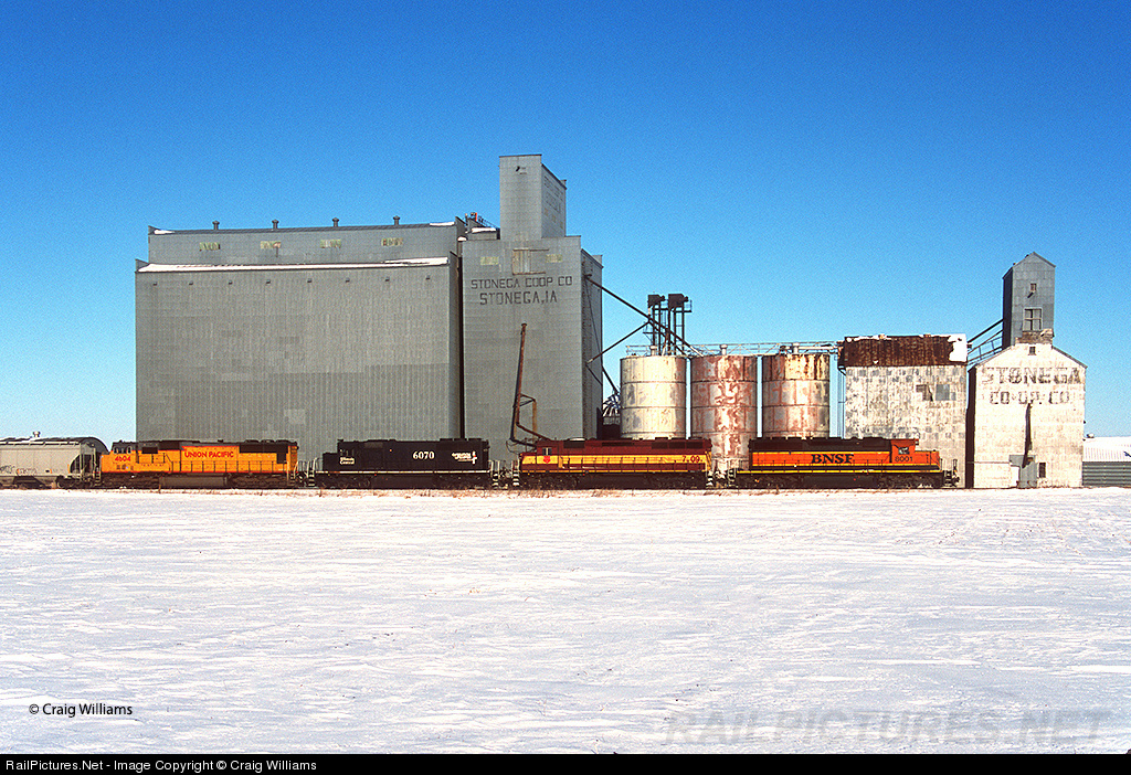 | A loaded grain train on the CN in Iowa has a mixed match of power as they head east towards Waterloo on this cold January morning. Here the train passes the old elevator at Stonega, about 5 miles east of Webster City. |