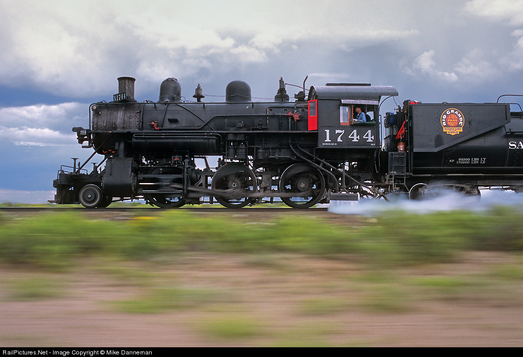 Flying through the San Luis Valley The crew on San Luis and Rio Grande 2-6-0 No. 1744 has an on time arrival of the afternoon passenger run in mind as the train cruises westbound between Blanca and Alamosa, Colorado, on August 12, 2007. Fireman John Charles has the former Southern Pacific machine firing nice and clean for the last few miles to the depot.