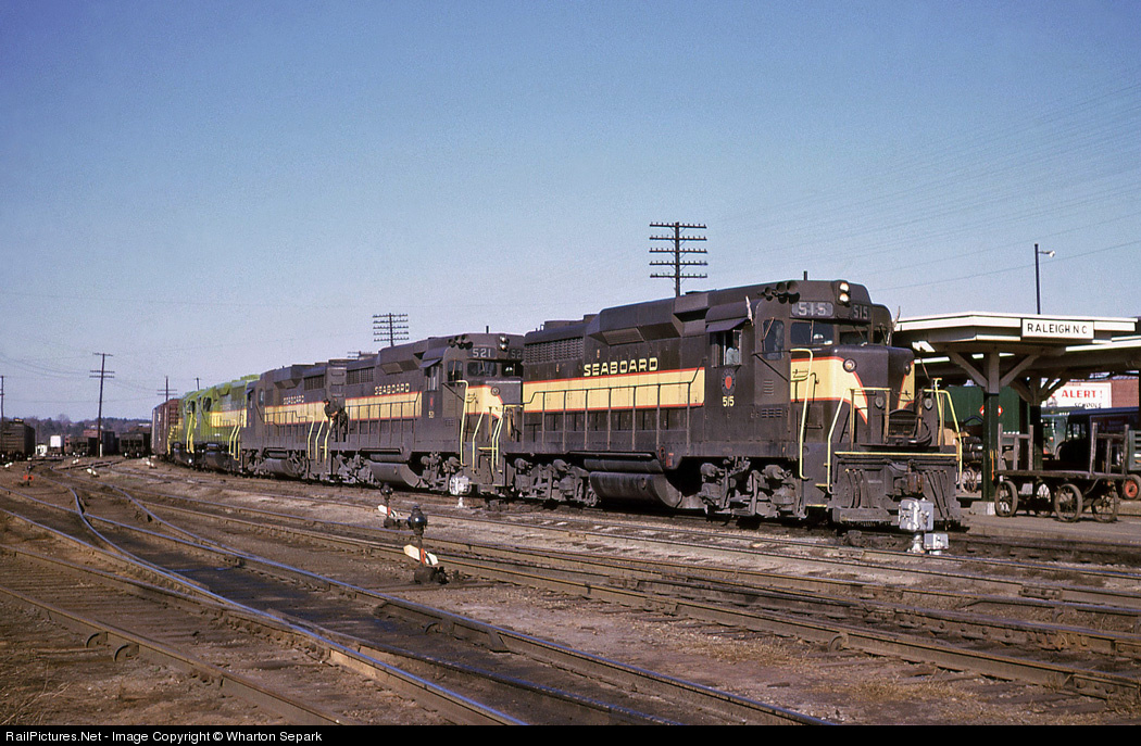 Operating as Extra 515 South, SAL No. 27 is approaching the Raleigh Roundhouse where a crew change will take place "on-the-fly". Tucked in behind the trio of GP30's are two brand new GP40's, in tow, on delivery from EMD. The new locomotives, sporting the new bright green livery will be placed in service at Hamlet Yard during the next week, joining the soon-to-be fleet of 51 new "Jolly Green Giants".