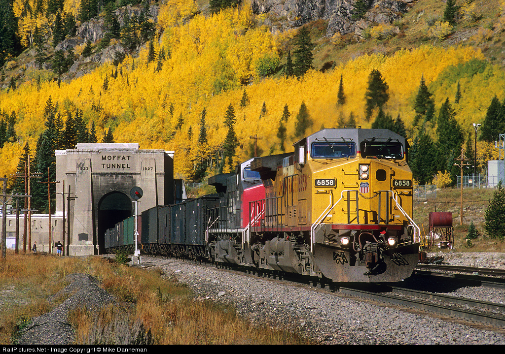 Yellow on yellow: The aspens are almost at their peak above the 6.21-mile Moffat Tunnel at East Portal, Colorado, on September 25, 1999. An eastbound Union Pacific coal train pops out of the tunnel led by two GE AC4400CWs: UP No. 6858 and Southern Pacific No. 253.
