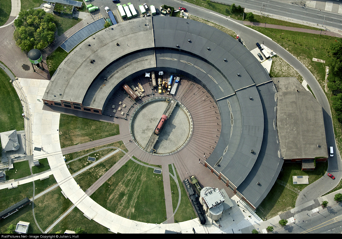 Pictured here, CP 7020 (donated to and preserved by the Toronto Railway Historical Association) sits on the turntable of the old John Street Roundhouse. Shot from Toronto's iconic CN Tower, 1135 feet above ground level.