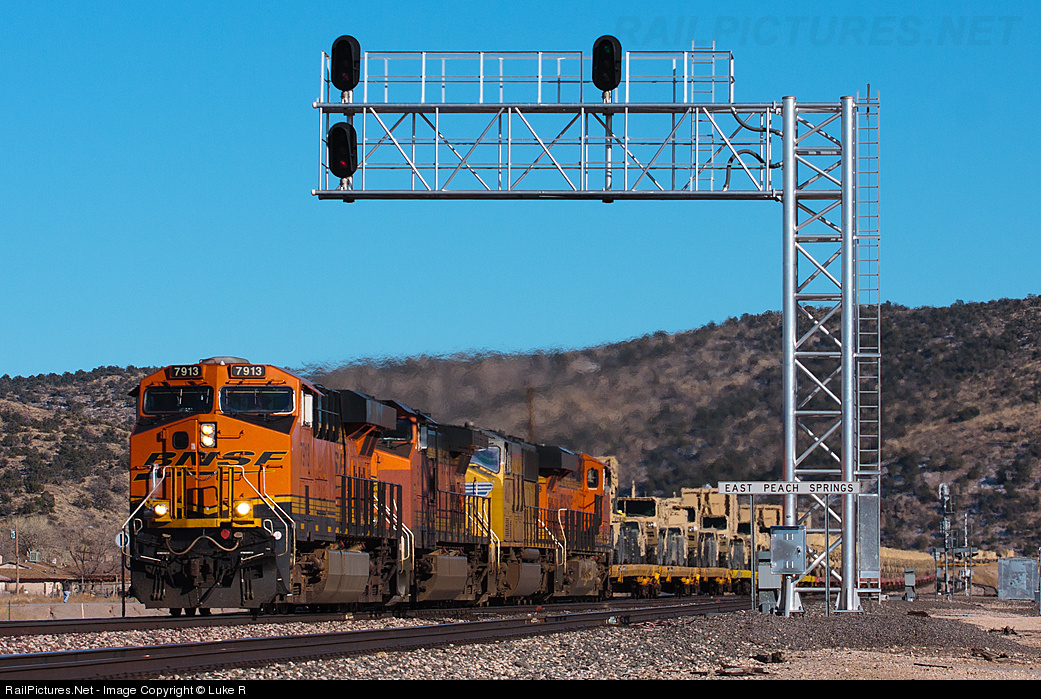 | After letting 3 higher priorty stack trains pass, BNSF 7913 leads the Yermo, CA bound U FTHBAR1 30A under the signal bridge in Peach Springs. |
