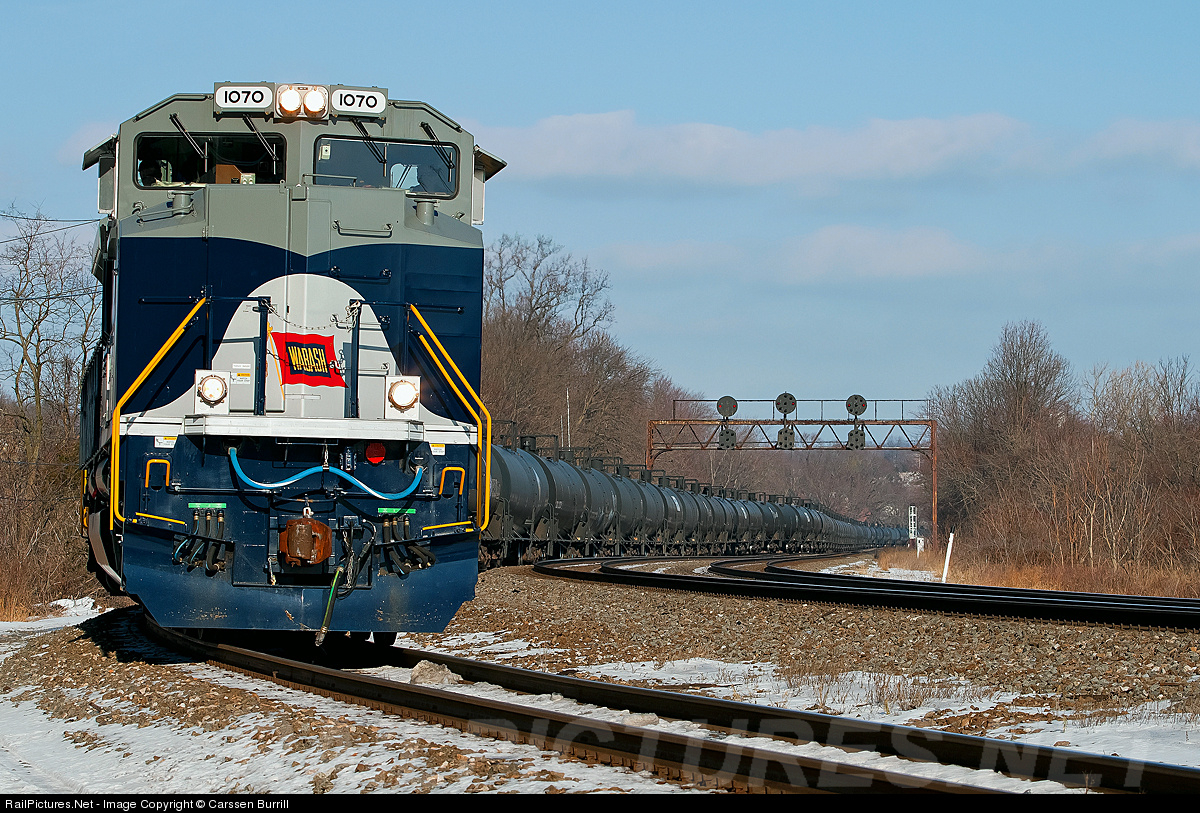The Wabash heritage unit leads a unit crude oil train past the signals at CP Cannon towards Enola yard.