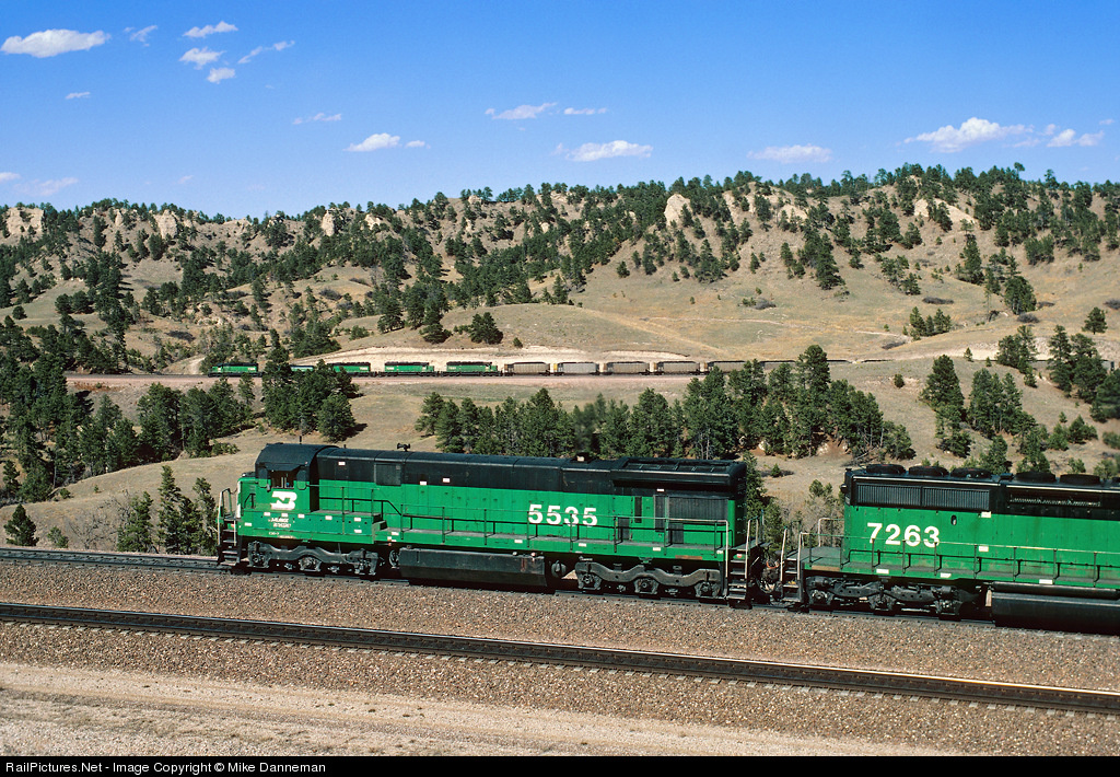Even though the date says it’s BNSF, its still is a Burlington Northern show on Crawford Hill on April 11, 1998. Five green GE and EMD products led by C30-7 No. 5535 are on the point of an eastbound coal load clawing up the horseshoe curve near Belmont, Nebraska. On the other side of the big curve and pushing hard on the rear of the train are four EMD SD40-2s splicing a fuel tender; one of Crawford’s helper sets.