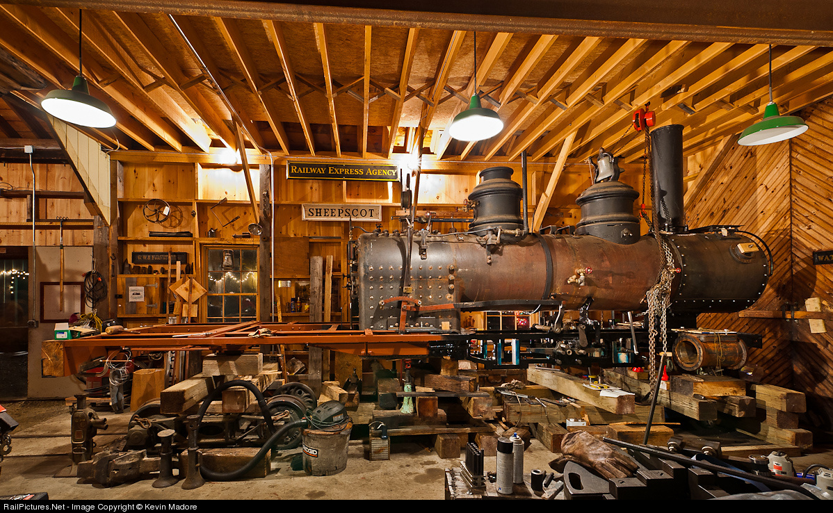 Engine engine number nine.... Tucked away in stall #1 of the WW&F Shops is a long-term project that is about to come to fruition. The locomotive seen here is an 1891 product of the Portland Company, in Portland, Maine. This 18-ton Forney was the 662nd locomotive to be built in Portand, and one of only 10 that the company built for service on Maine's 2-foot railroads. Originally built for the Sandy River Railroad, she also served the Sandy River and Rangeley Lakes Railroad and the Kennebec Central, before being purchased by the WW&F in 1933, when that line found itself literally out of usable power. She served the WW&F as their Number 9 for just a very short few months before the line ceased operation and went under. Before all of the WW&F's equipment could be scrapped, this engine was rescued by some folks from Connecticut, who hoped to set up a narrow gauge railroad park on their property in Thompson, CT. Nothing ever came of that plan, and old Number 9 spent the next 50 years in a barn....no kidding.